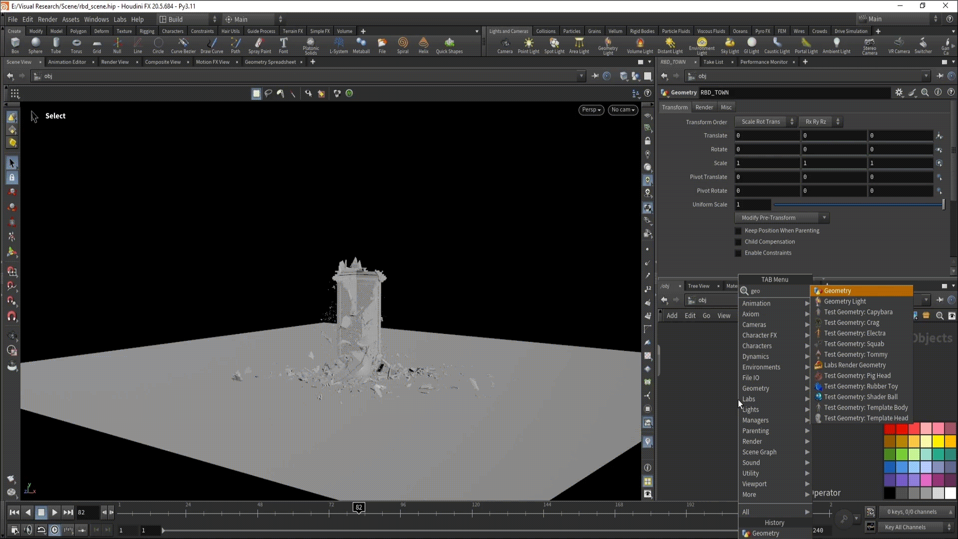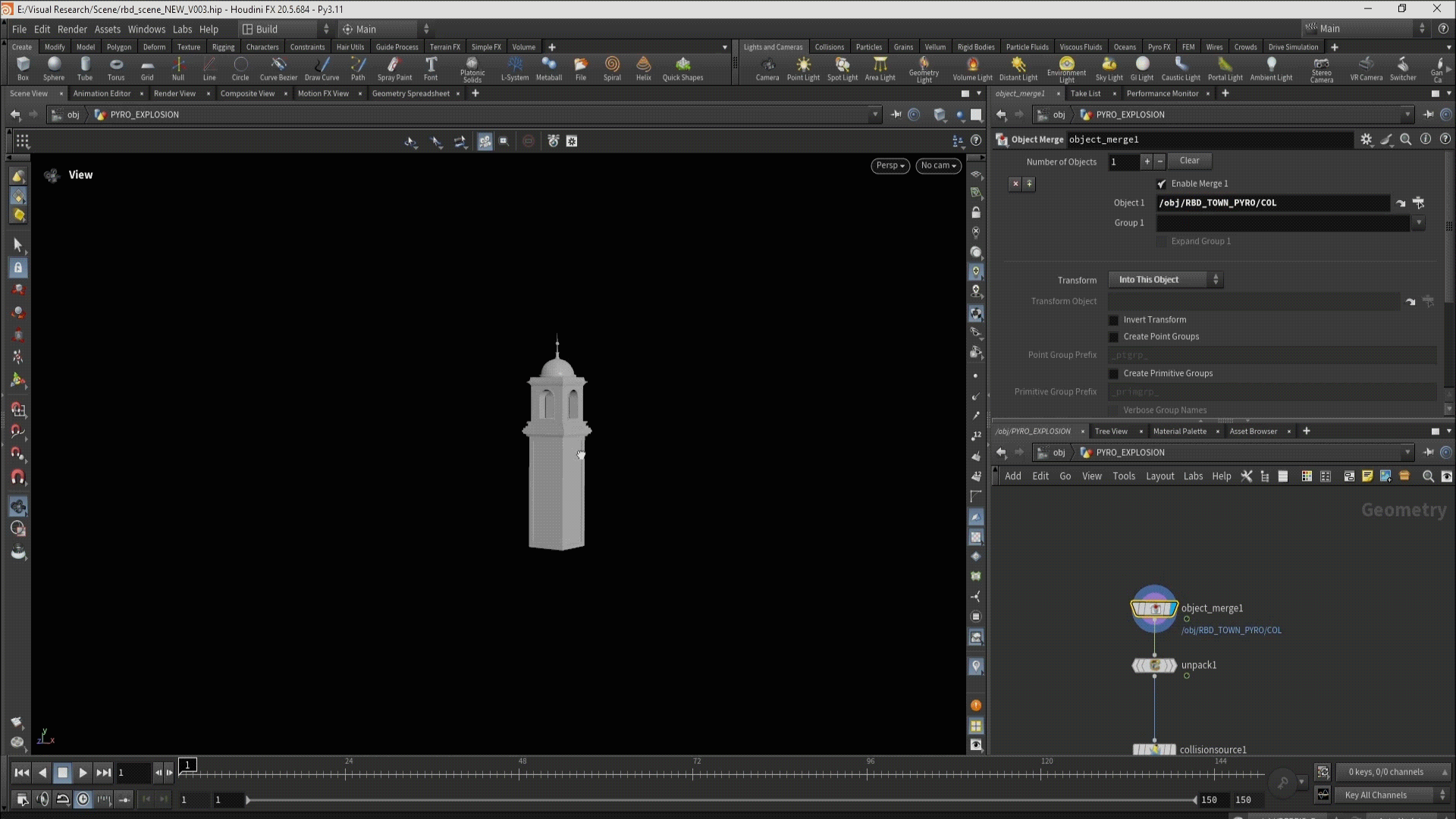 В процессе моделирования взрыва применялась коллизия, которая играла ключевую роль в создании правдоподобной симуляции. Для корректного переноса эффектов разрушения необходимо в контейнере геометрии создать узел «null», а затем использовать его в узле «object merge». Параметр «transform» следует установить в положение «into this object». Это обеспечивает сохранение трансформационных свойств геометрии и её корректное отображение в пространстве.