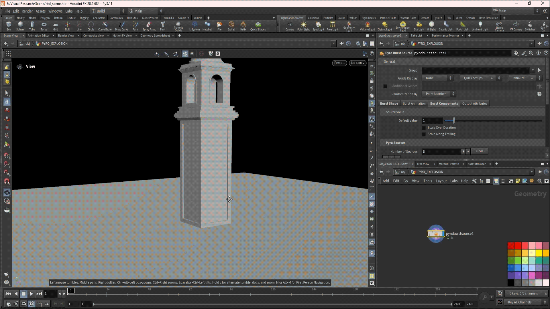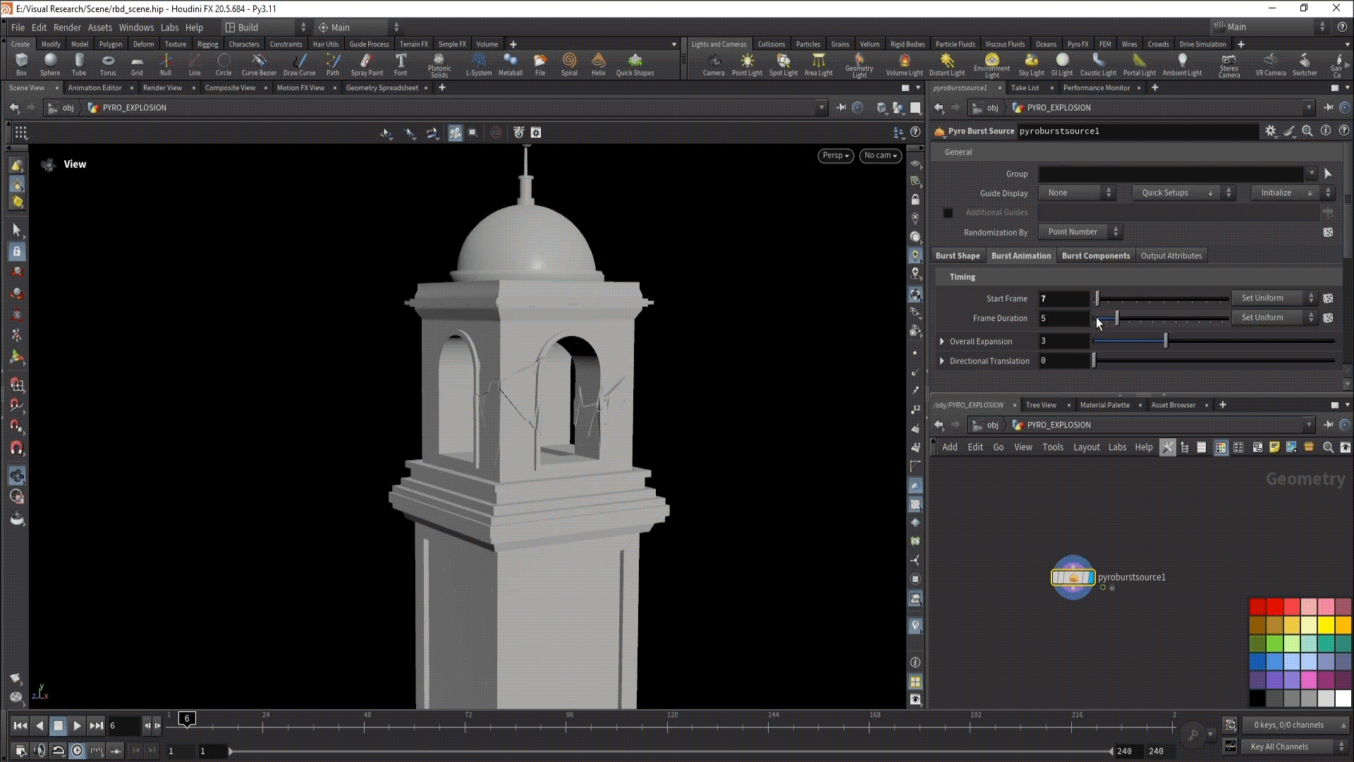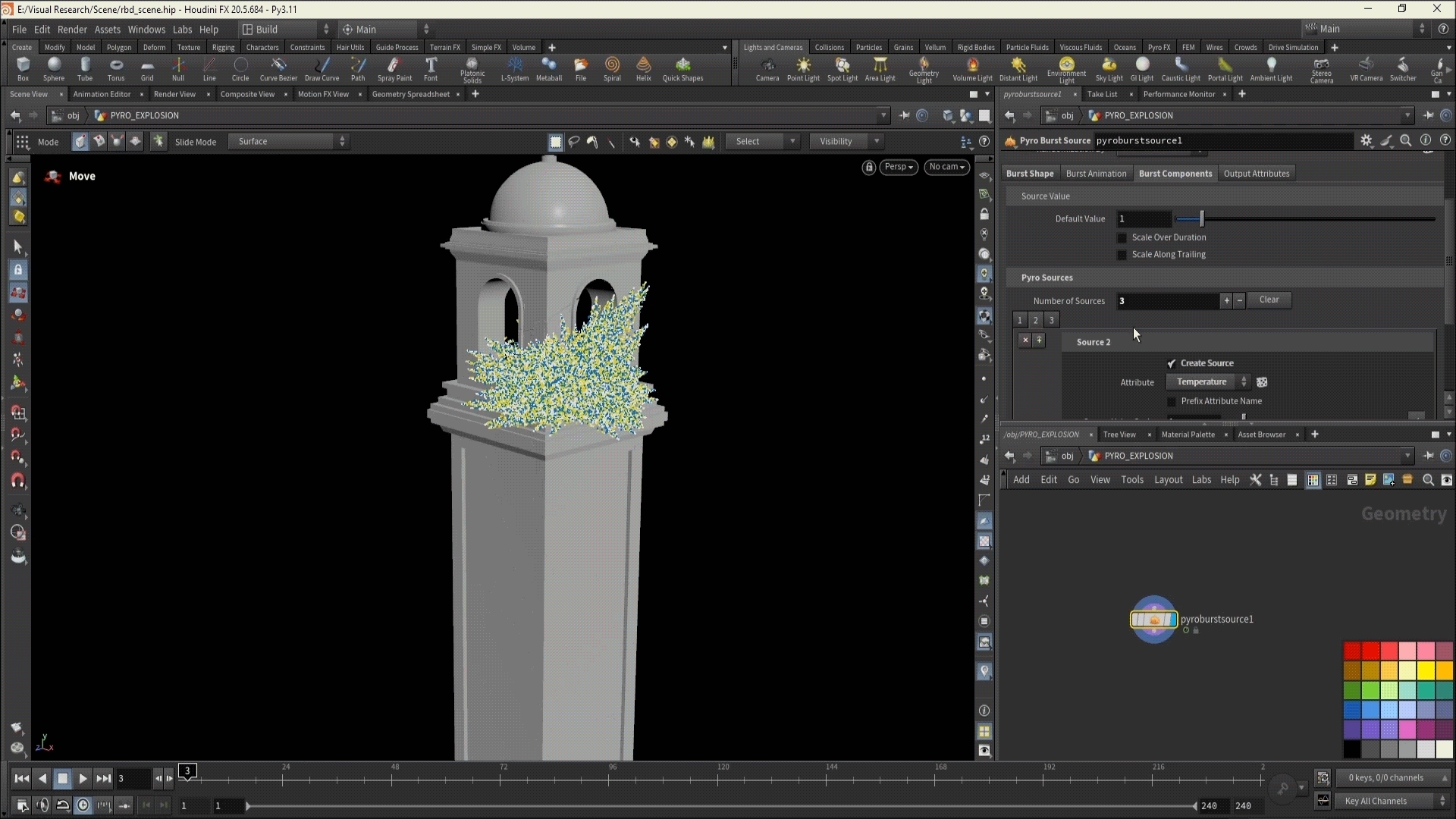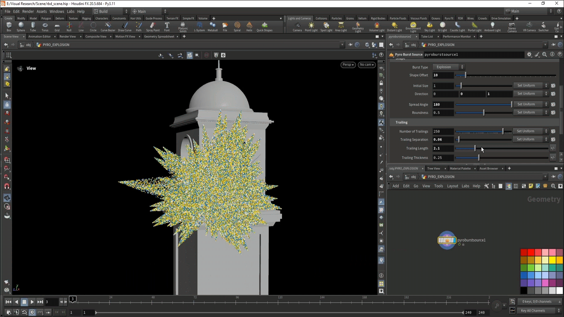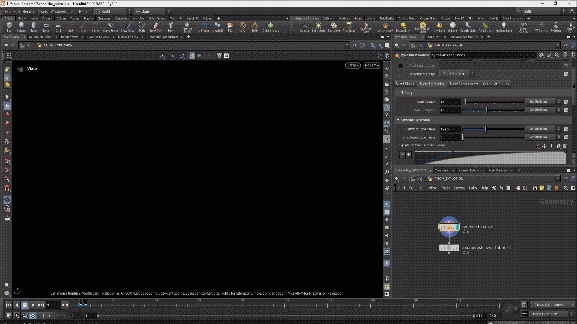 Следующим шагом для реализации симуляции взрыва является создание эмиттера с использованием ноды «pyro burst source». По своей функциональности данная нода схожа с pyro source, рассмотренной в предыдущих этапах, однако «pyro burst source» обеспечивает более точное моделирование взрывного процесса с использованием частиц. Её преимуществом является широкая возможность настройки параметров, что позволяет адаптировать модель под конкретные условия. Именно по этой причине данный метод часто выбирают специалисты в области симуляции.