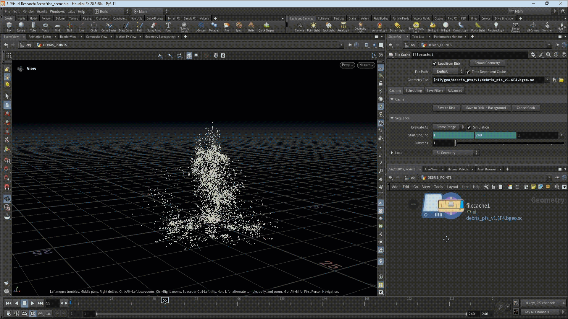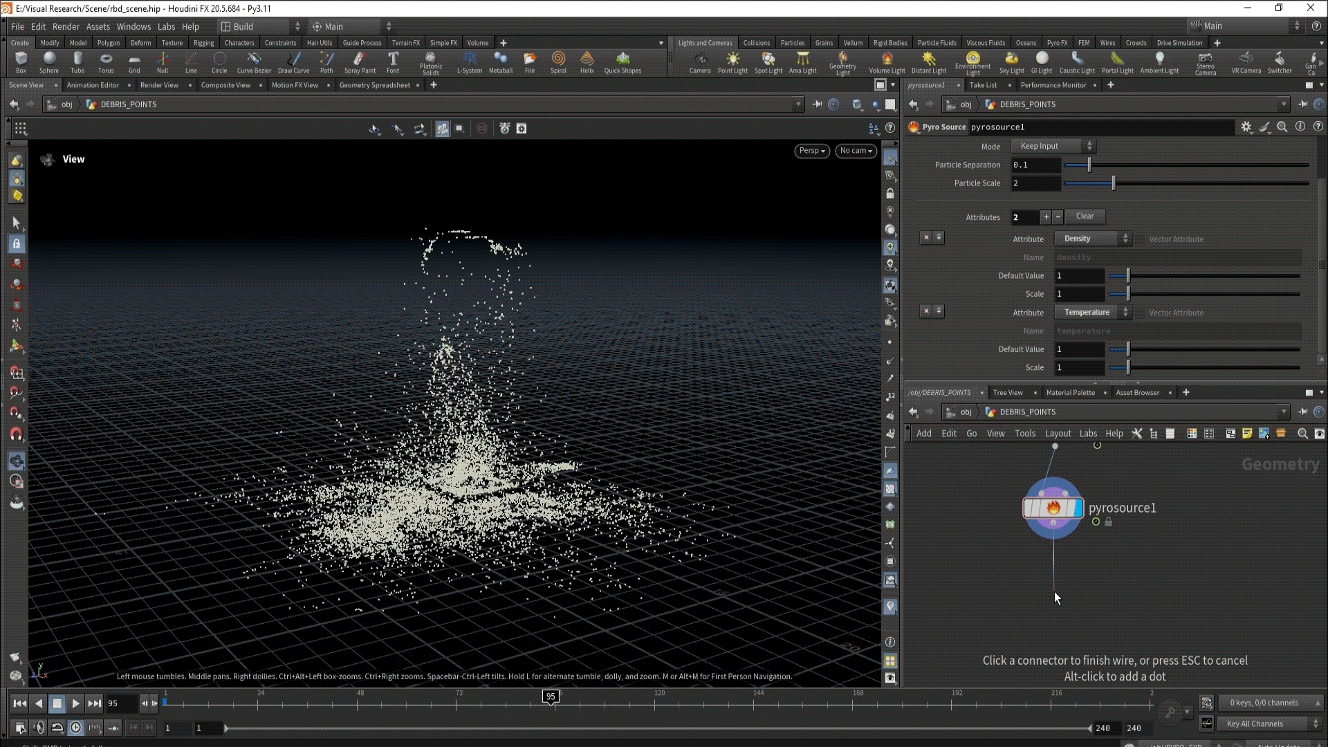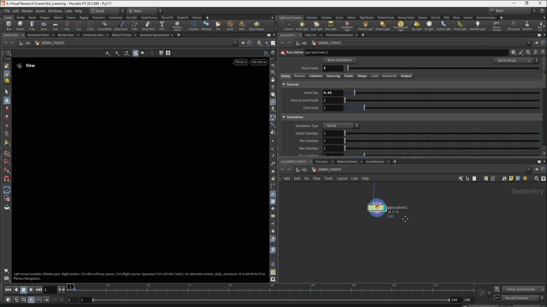 Debris представляет собой симуляцию дыма, возникающего при падении обломков вследствие разрушения. Для достижения этого автор визуального исследования выделил ключевые точки и провел симуляцию частиц, обозначенных как «debris_pts».