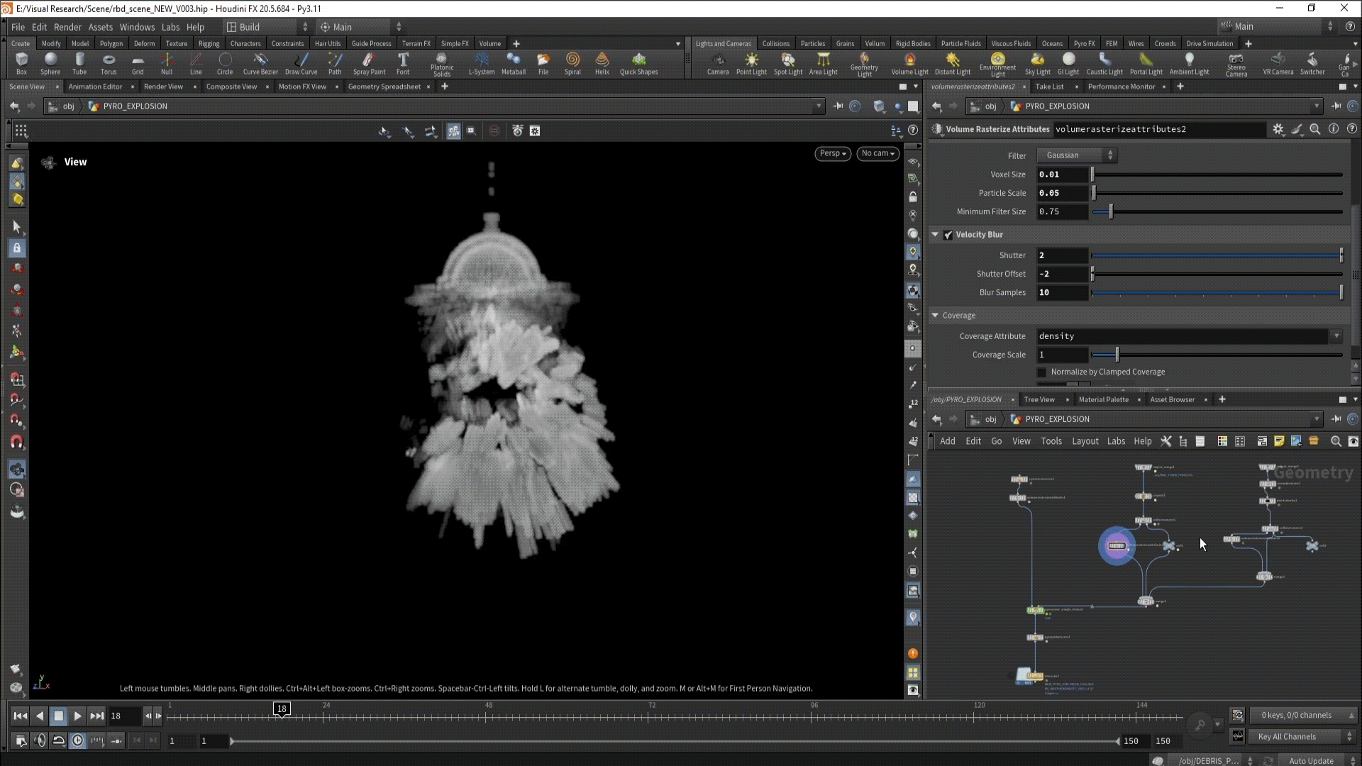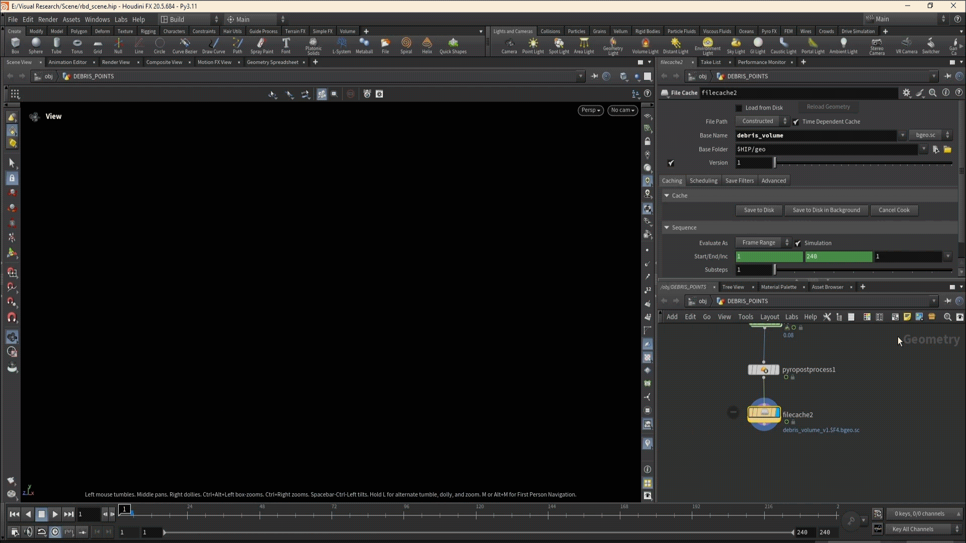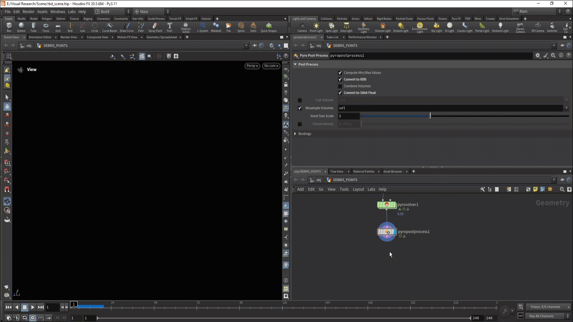 Для того, чтобы сделать кэш взрыва, необходимо вытащить ноду «pyro post process», которая конвертирует дым в VDB, для того, чтобы на рендере программа смогла увидеть поля, созданные при симуляции и корректно зашейдить.