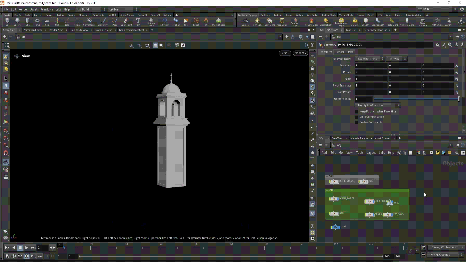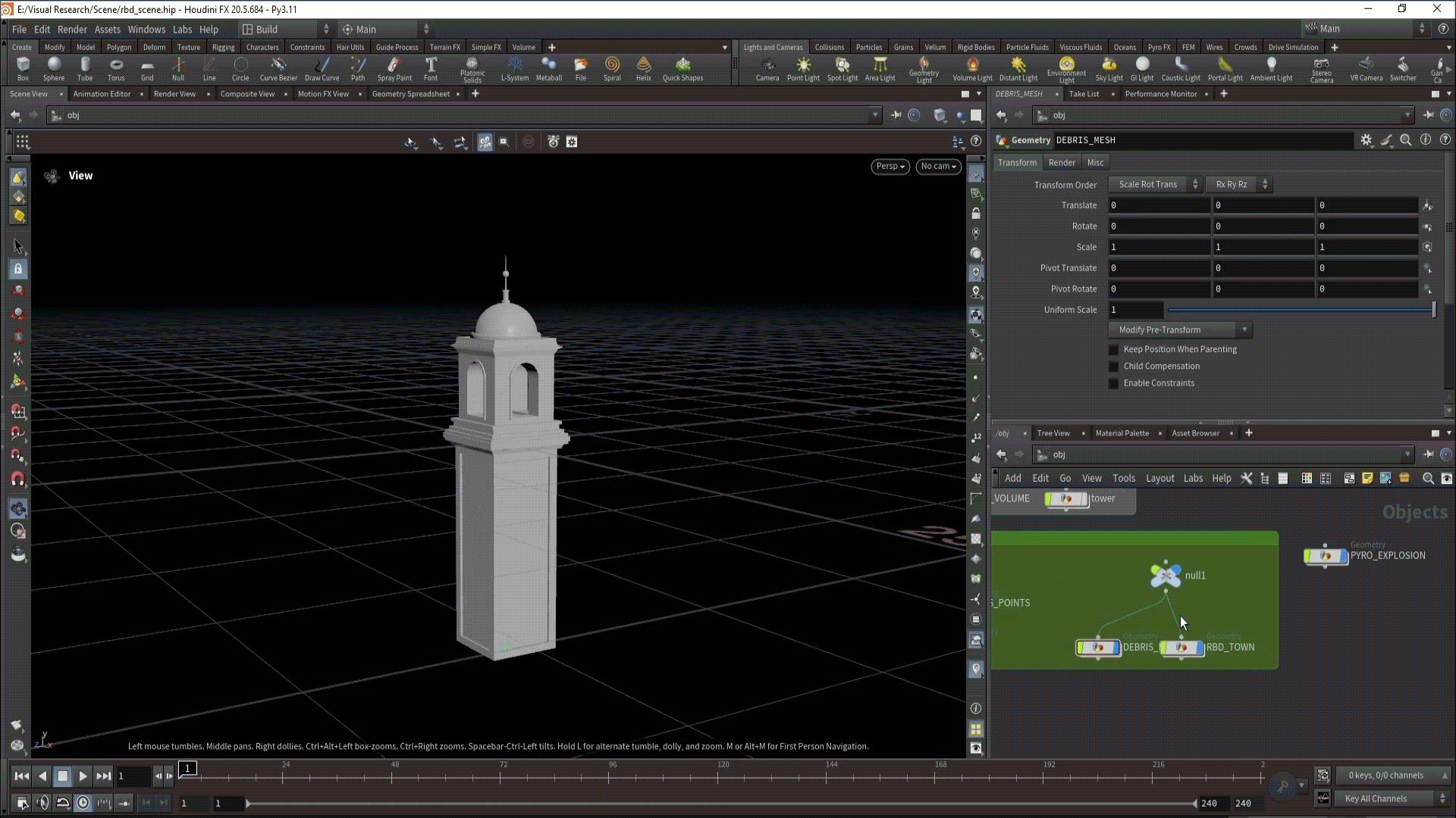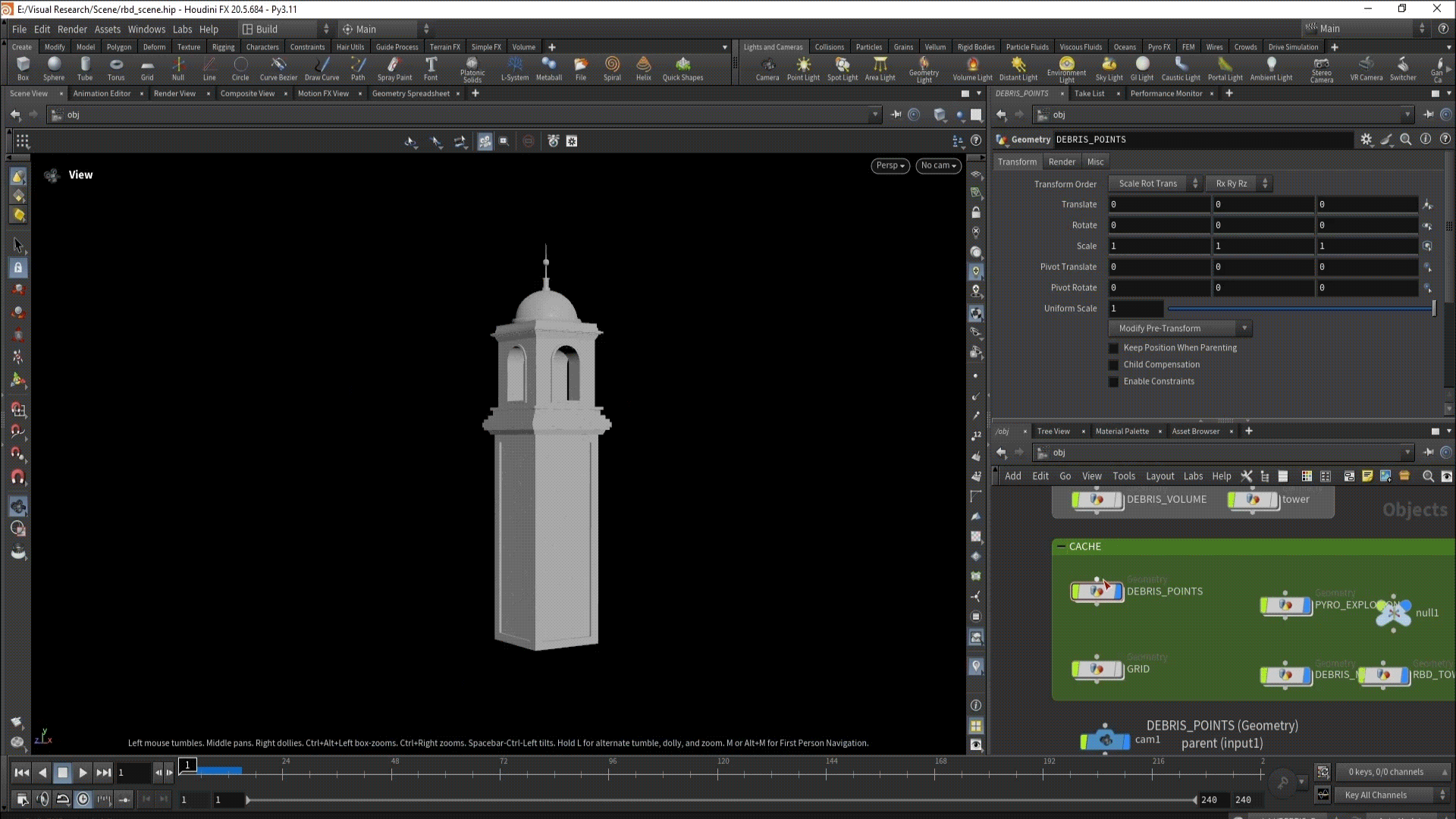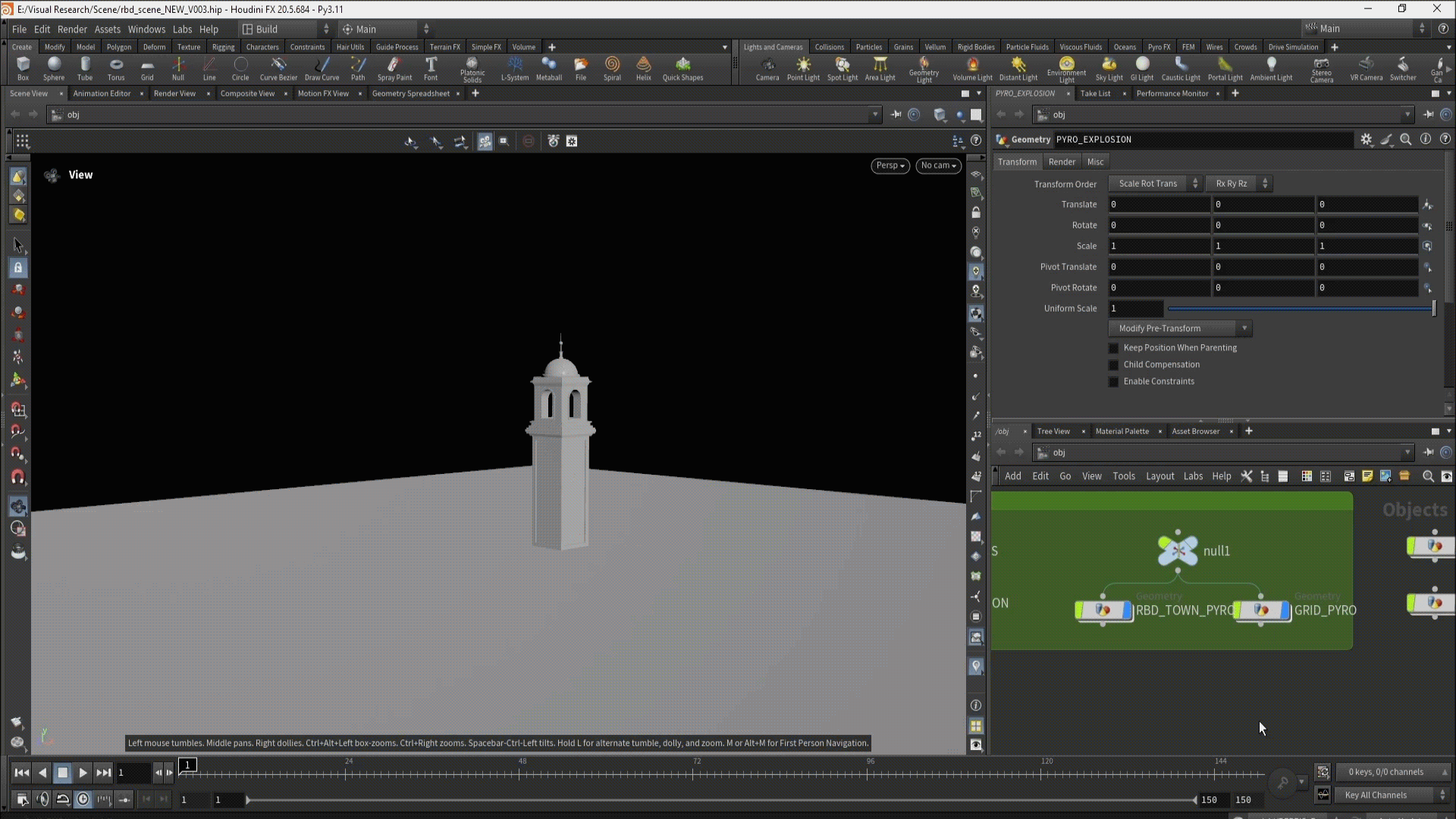 Генерация точек источника начинается с координаты нуля. Чтобы упростить процесс настройки симуляции, рекомендуется переместить сцену с разрушением башни в область, где создаётся взрыв. Это можно выполнить с помощью использования элемента null в контексте obj. Такой подход способствует повышению удобства работы и минимизации возможных проблем с параметризацией на последующих этапах.