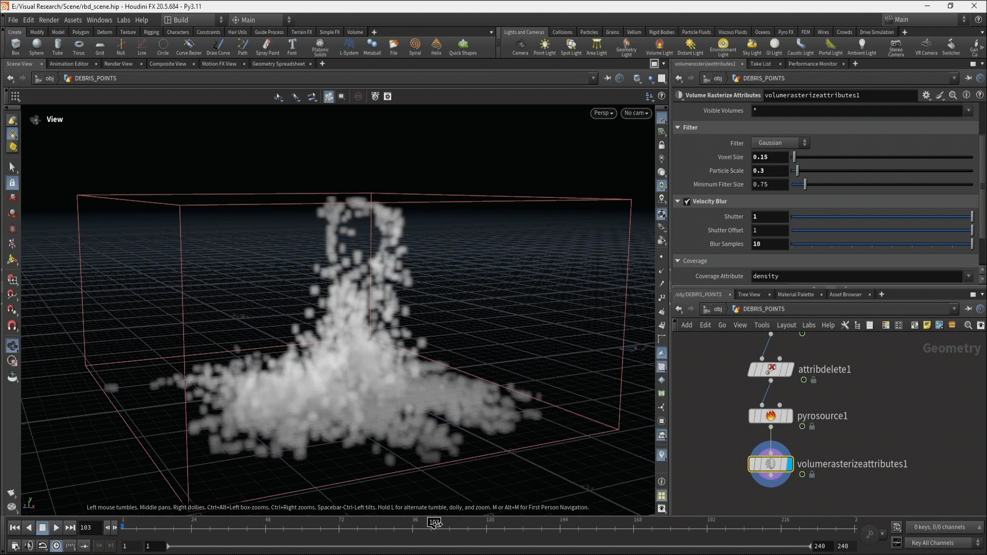 Для узла, отвечающего за растеризацию атрибутов, полезно применять функцию «velocity blur». Данная функция позволяет создавать эффект размытия поля скорости. Настройка параметра «shutter offset» с отрицательным значением предоставляет возможность добиться эффекта, при котором разлетающиеся фрагменты генерируют дымовые шлейфы.