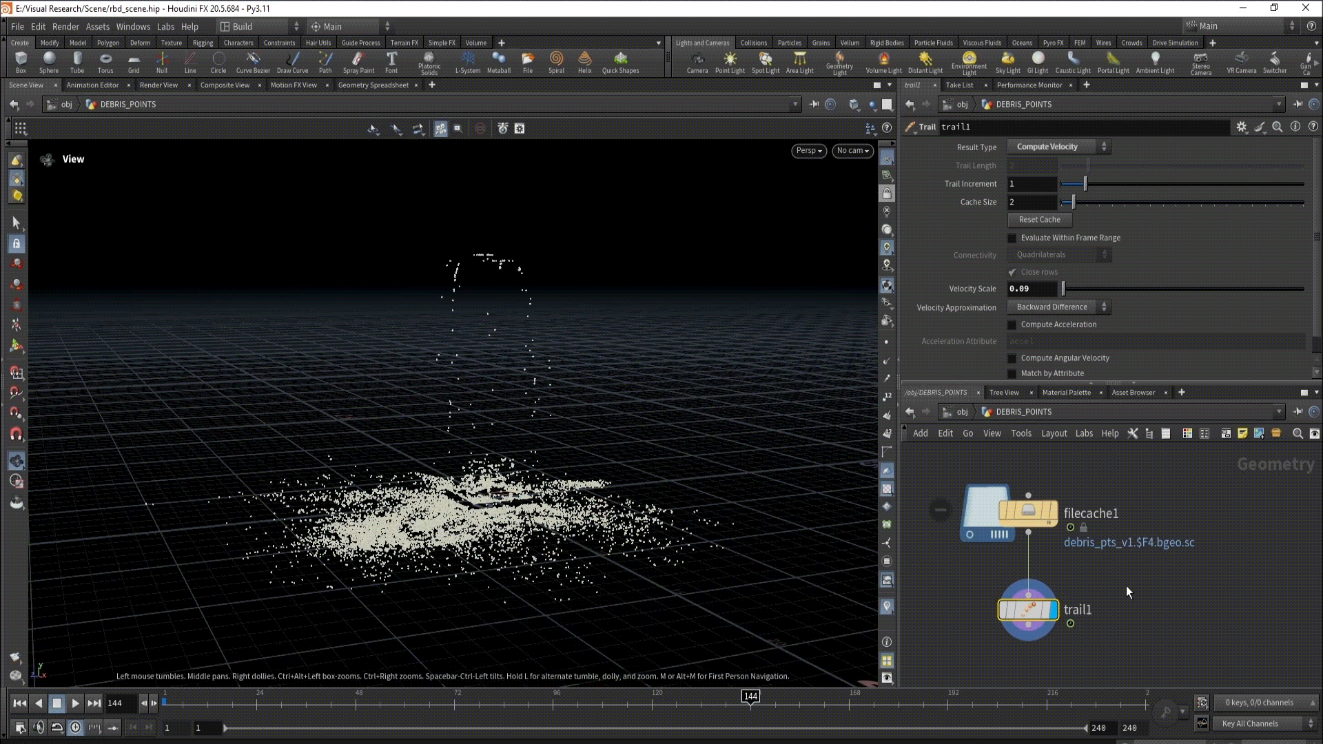Чтобы подготовить точки для Pyro, нужно создать атрибут «v» с помощью ноды «trails». Трансформации в контексте «obj» были удалены, поскольку точки от осколков уже закэшированы в правильном положении и не требуют дополнительной трансформации.