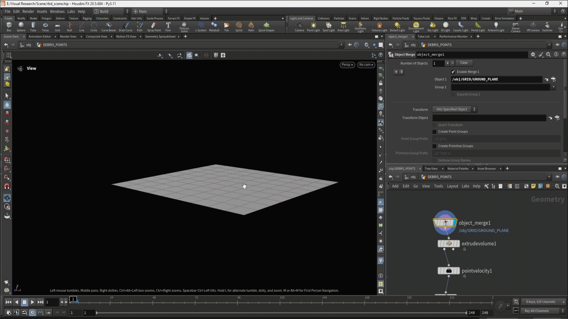 Чтобы корректно перенести геометрическую плоскость, необходимо воспользоваться тем же методом: скопировать путь через узел «null» и экспортировать его в «object merge». Узел «extrude volume» играет важную роль в добавлении объёма, вытягивая плоскость вниз и тем самым создавая пространство для заполнения объёма вместе с добавлением атрибута «v». Эти шаги повторяют методику, описанную ранее при рассмотрении симуляции системы «Pyro».