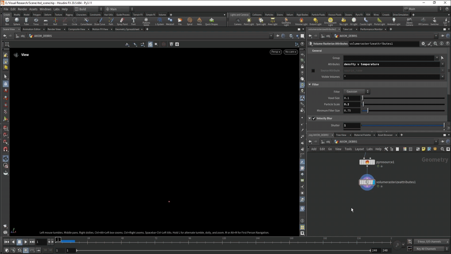 Что касается симуляции в Pyro, то длительное время загрузки усложняло процесс работы, из-за чего некоторые параметры не были реализованы так, как первоначально планировалось. Хотя показатели рассеивания и охлаждения воздуха достаточно низкие, дым от симуляции испарился слишком быстро, что негативно сказалось в итоге. В то же время debris вышел намного более проработанным и эффектным, чем в Axiom, поскольку коллизия в этом солвере лучше справилась с отображением структур дымовых облаков.