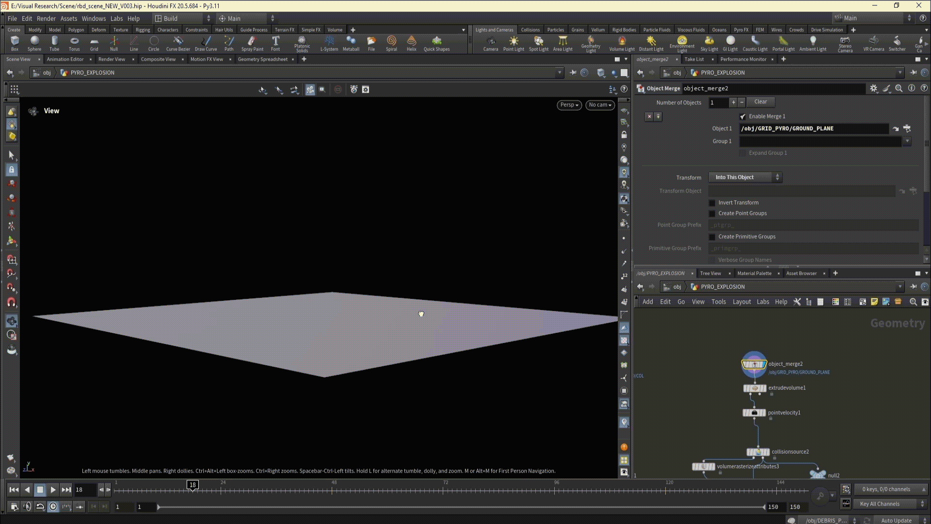 Чтобы добавить необходимую геометрию для коллизии, нужно создать ноду «null», скопировать её путь с помощью комбинации клавиш Ctrl + C и вставить его в ноду «object merge», в которой находится симуляция pyro. Автор применил «extrude volume» к плоскости для заполнения внутреннего пространства и выполнения необходимых операций по созданию sdf для коллизии.