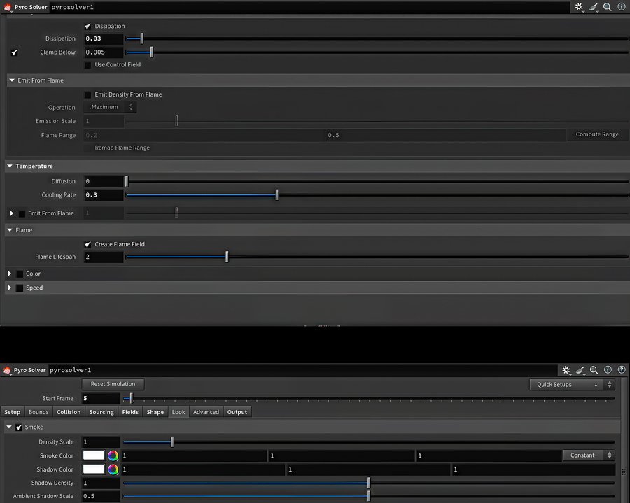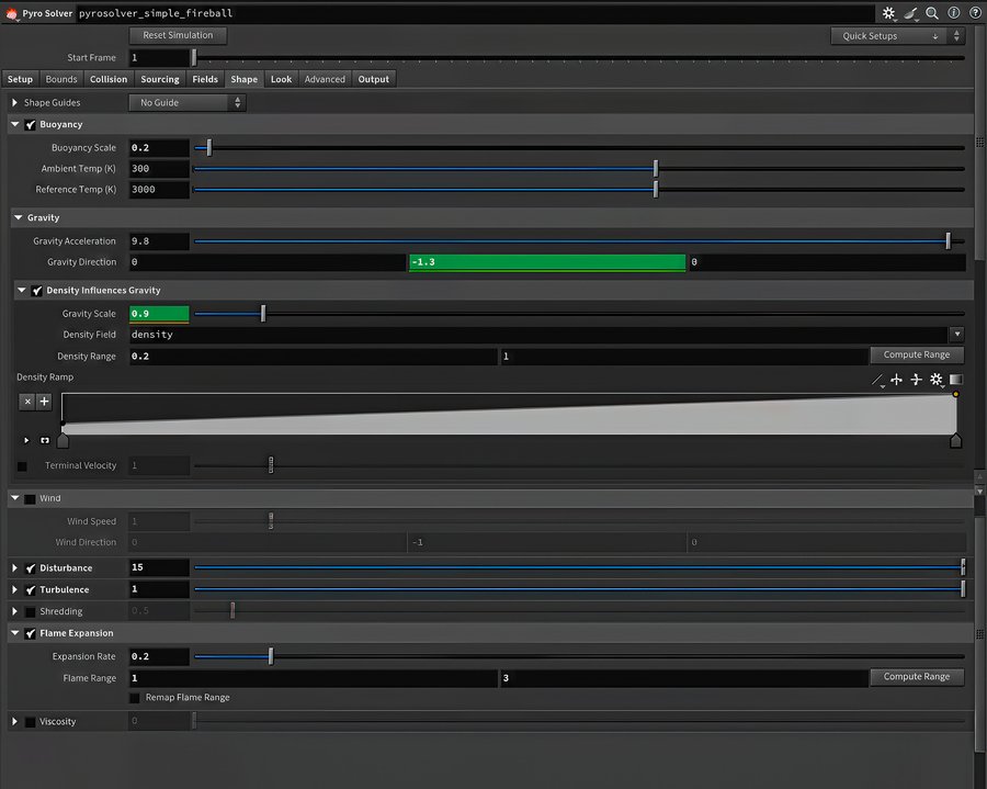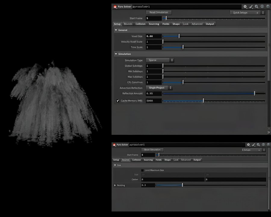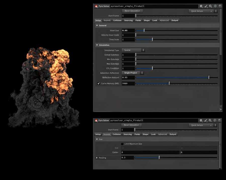 После создания общего эффекта разлетающихся частиц необходимо перейти во вкладку «quick setups» и выбрать «pyro simulation». Это действие автоматически создаст готовую настройку для симуляции, параметры которой можно редактировать.