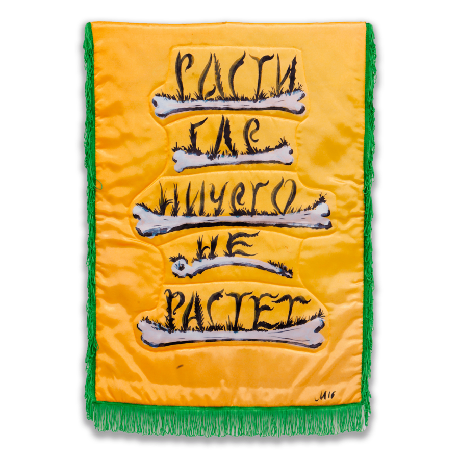 Дамир Муратов. Коврик «Почта Сибири», 2017. Полиэстер, вышивка.80×50 см / Дамир Муратов.Коврик «Расти где ничего не растет», 2017. Полиэстер, вышивка. 87×62 см