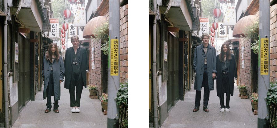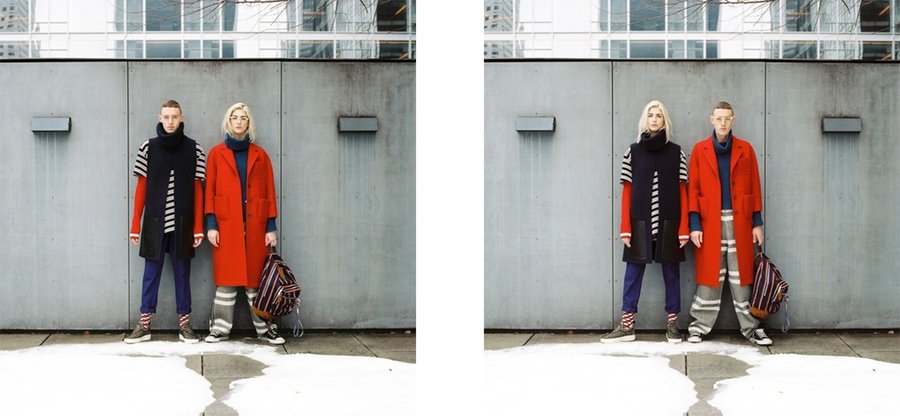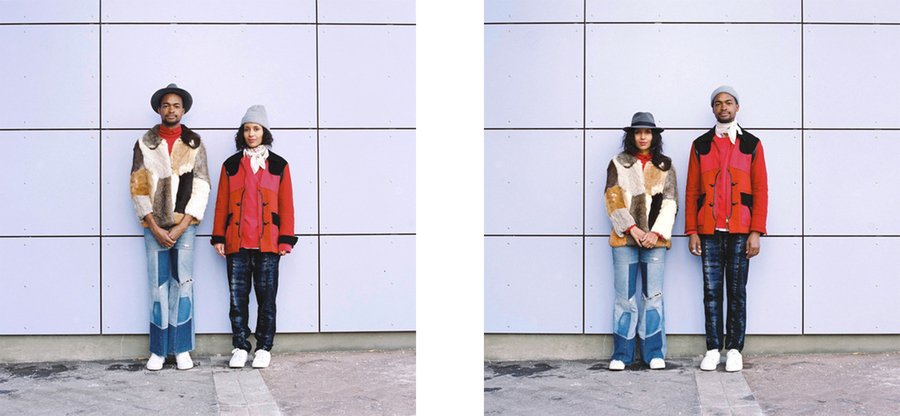 Фото-серия «Switcheroo» Ханы Песют иллюстрирует иной, более сдержанный и практически лабораторный способ показать связь. Песют максимально «очищает» кадр от эмоций, играя с формальным признаком парности — она просит пары поменяться одеждой, оставляя фон и позы неизменными.