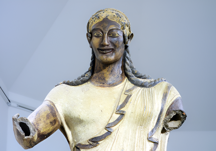 Реконструкция святилища Портоначчо (Вейи, VI в. до н. э.) с акротериями: терракотовые фигуры Аполлона и других богов / Аполлон из Вейи (терракотовая статуя с крыши святилища Портонач)