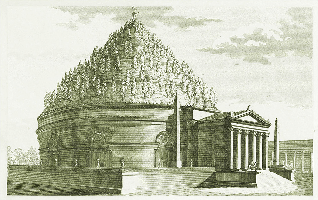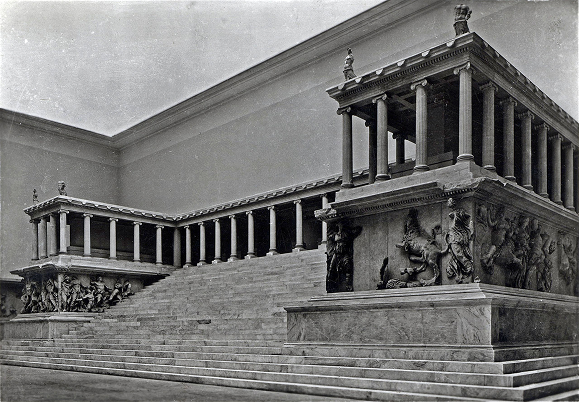 Мавзолей в Галикарнасе — образец смешанной архитектуры поздней классики (греческая колоннада + восточная ступенчатая масса), ставший одним из источников монументальной эстетики Рима эпохи Принципата.