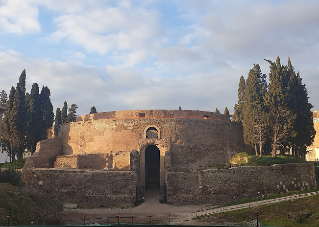 Круглая форма восходит к этрусским курганам, но новая масштабность и урбанистический контекст делают его символом власти.