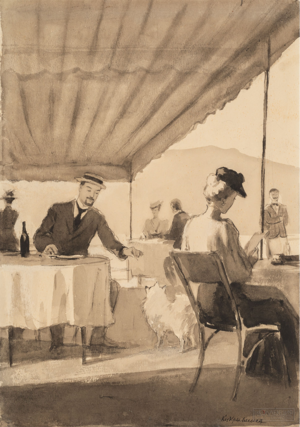 «Дамы и господа, сидящие на пляже с собакой» Эжен Буден, 1866; «В ресторане. Иллюстрация к рассказу А. П. Чехова „Дама с собачкой“» Куприянов М. В., Крылов П., Н., Соколов Н. А, 1945