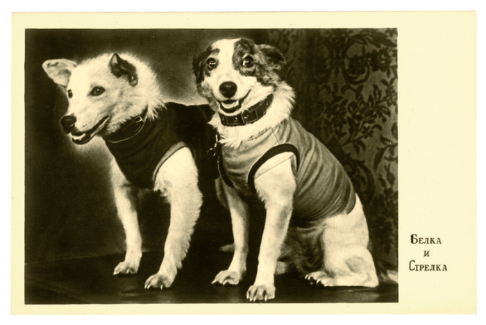 Фотография Белки и Стрелки с их первой пресс-конференции, 1960; Обложка книги «Советские космические собаки»