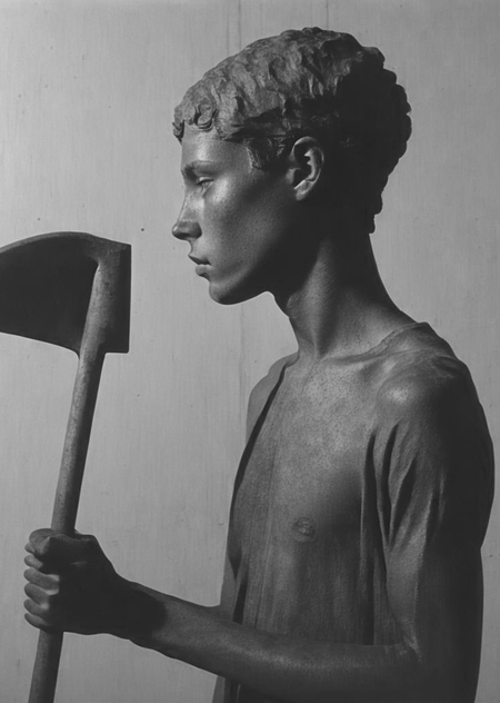 Профильный портрет с орудием труда возвращает зрителя к строгой фронтальности первого изображения, но добавляет утилитарный атрибут. Герой выглядит сосредоточенным, готовым к действию, но действие остаётся за кадром. Инструмент является символом возвращения к первобытному труду и простому мироустройству, в то же время напоминая о цикличности всего. Рано или поздно общество разовьется и вернется в точку апокалипсиса.