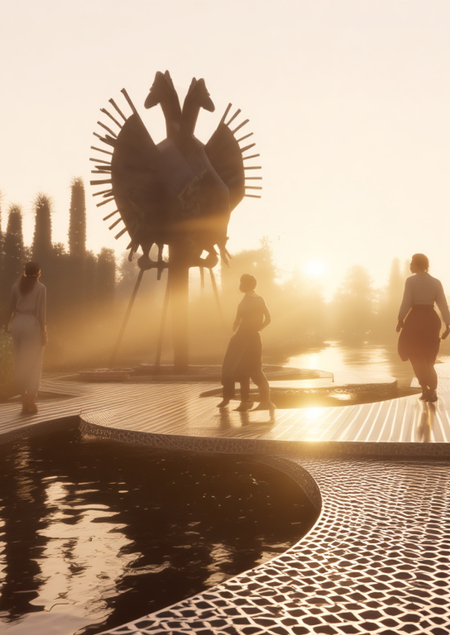 Важной деталью для сада выбрана работа Николая Полисского — Жар-птица и это сделано не просто так, она решает сразу несколько стратегических задач: