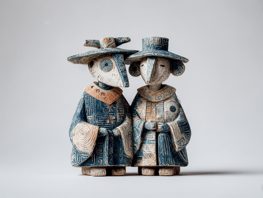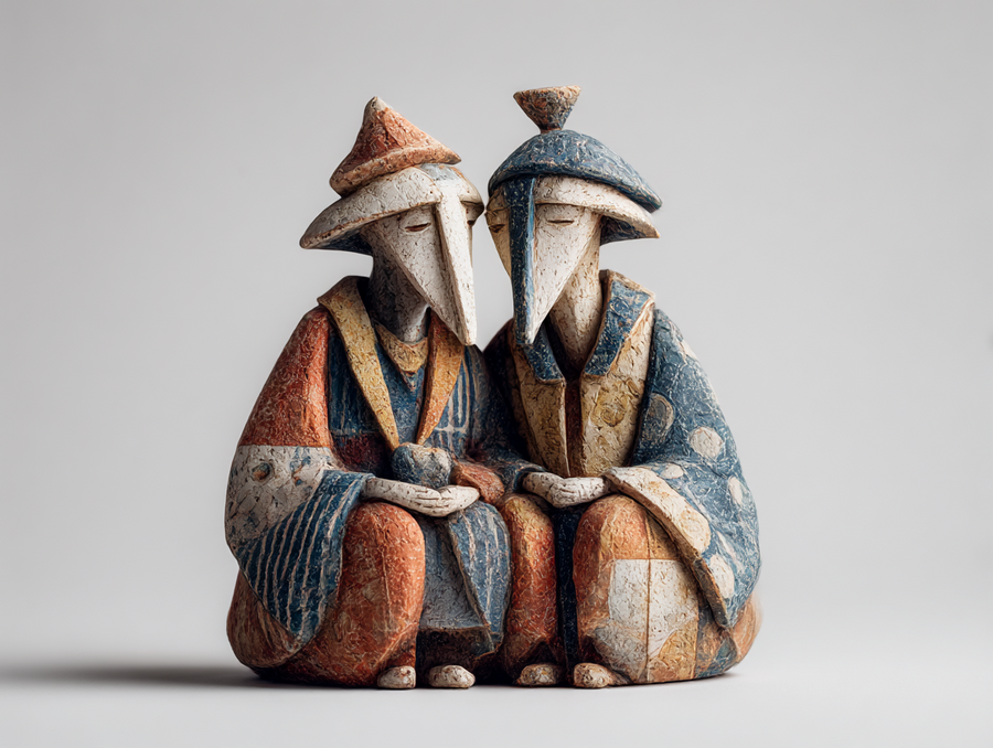 Промт для создания изображения в Midjourney Bot: The photo shows a realistic three-dimensional image of two clay figurines. The figurines are made in the Picasso style of the African period using white, terracotta and blue colors. The background is white.