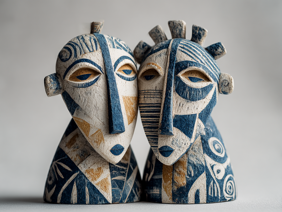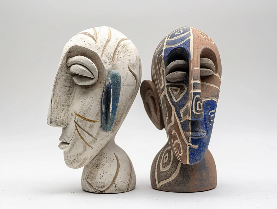 Промт для создания изображения в Midjourney Bot: The photo shows a realistic three-dimensional image of two clay heads. The heads are made in the Picasso style of the African period using white, terracotta and blue colors. The background is white.