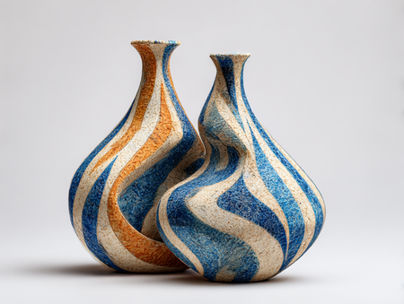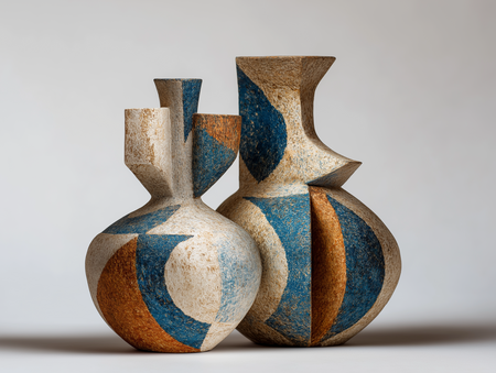 Промт для создания изображения в Midjourney Bot: The photo shows a realistic three-dimensional image of two clay vases. The vases are made in the Picasso style of the African period, distorted shapes using white, terracotta and blue colors. The background is white.