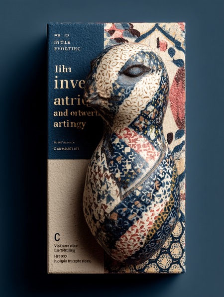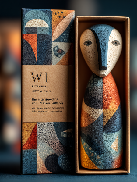 Промт для создания левого изображения в Midjourney Bot: photo of a statuette made of blue-white and terracotta clay. The figurine is in a cardboard box decorated with Picasso patterns from the African period. The author’s text «the interweaving of art and antiquity» is written on the box. The packaging is modern, unique and reminiscent of Picasso.