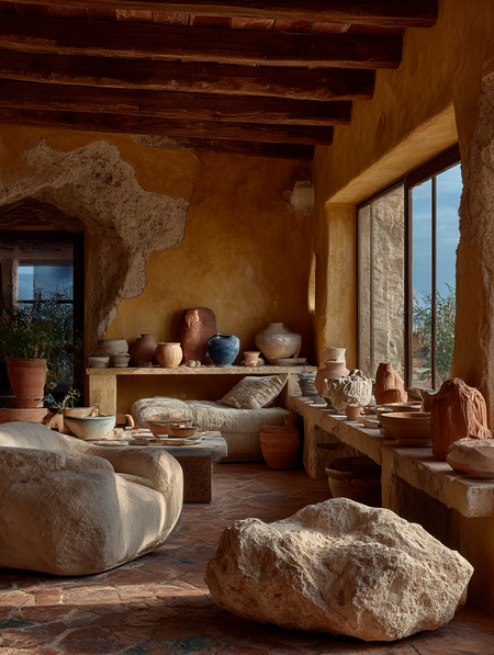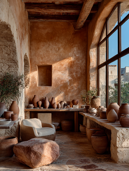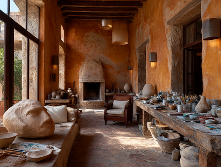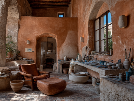 Промт для входной зоны в Midjourney Bot: Photo of a private pottery workshop based on Picasso’s African period. The workshop is a bright room with ancient architecture and modern touches in the form of furniture. The interior exudes tranquility thanks to references to the people, clay and soft lighting. There are several ready-made clay figurines in the room. The walls are painted an ochre brick color. Large windows, stone flooring.
