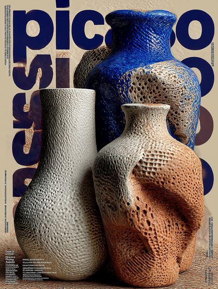 Промт для создания правого изображения в Midjourney Bot: An African advertising poster for a clay workshop specializing in strange Picasso-style vases from the Afrin period. The poster depicts vases in 3D in white, blue, and terracotta. The background contains subtle African patterns and the text inscription «Picasso». Для перевода использовался Deepl.