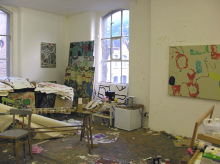 Художник Базз Спектор в своей главе «Каждая студия, которая у меня была после окончания колледжа» [2], описывает первое пространство как «вторую спальню в квартире» [2], где рисунки хранились под кроватью, а единственная книжная полка была сделана из досок и бетонных блоков, что показывает минималистичную, почти аскетичную организацию пространства.