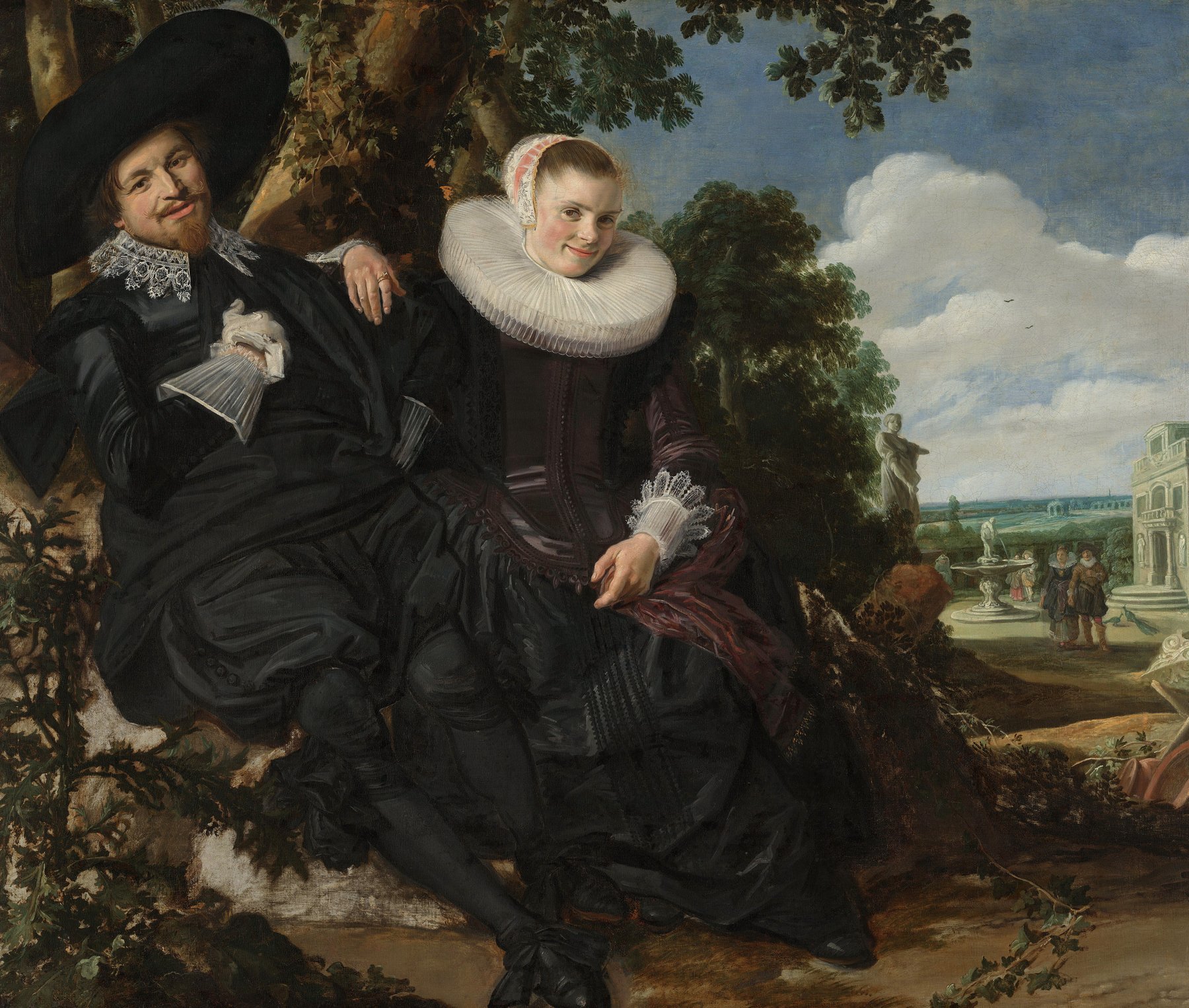 На картине «Портрет супружеской пары, возможно Исаака Абрахамса Массы и Беатрикс ван дер Лаен», созданной около 1622 года, голландский художник Франс Хальс демонстрирует сложную, почти психологическую сцену, в которой социальные роли мужа и жены, их характеры и взаимоотношения, читаются через жест, посадку, поставы тел, выражение лиц. Пара сидит на скамье в саду возле дерева, что довольно редко для портретной традиции XVII века. Хальс, мастер живого мазка и точной интонации, предлагает увидеть живой момент в пространстве повседневного достоинства, взаимоуважения и камерной близости.