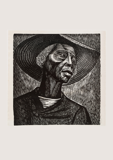 Например, линогравюра «Sharecropper» открывает нам образ женщины-работницы, где крупные чёрные и белые массы формируют не столько объём, сколько силу, достоинство, но в то же время усталость. Выбор направления реза создаёт резкие перья света, которые только подчёркивают внутреннюю силу героини.
