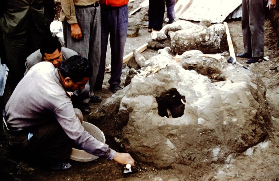 (1) Раскопки Помпей, 1961, фото: Стэнли А. Яшемски; (2) Беглецы появляются. Жертвы 46, 47, 36 и 37, фото: Стэнли А. Яшемски, 1961