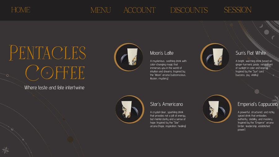 The goal is to convey to the audience that «Pentacles coffee» is not just an ordinary cafe where you can stop by on your way to work just for coffee, but a place where you can relax and immerse yourself in the atmosphere of magic and Tarot cards.