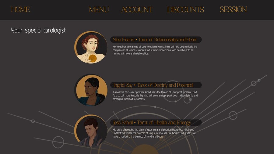 1.Creating an emotionally positive positioning in which the Tarot is considered as an aesthetic system of signs that forms a unique user experience. With the help of visual (soft contrasts, arcana symbolism, stylized patterns), sensory (sound, color, aromatic associations) and eventful (serving rituals, «arcana of the day», interactivity) codes, we increase emotional engagement and form a stable visual identity.