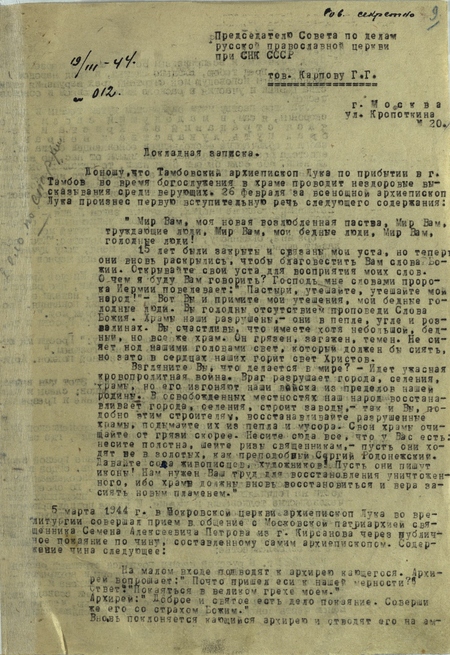Справка о регистрации архиепископа Луки // 29 февраля 1944 года