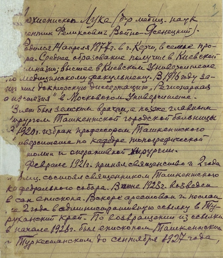 Архиепископ Лука (в миру Валентин Феликсович Войно-Ясенецкий) родился 27 апреля 1877 г. в Керчи, в семье провизора. Среднее образование получил в Киевской гимназии, высшее — на медицинском факультете Киевского университета. В 1916 году защитил докторскую диссертацию «Регионарная анестезия» в Московском университете. 13 лет был земским врачом, а позже — главным хирургом Ташкентской городской больницы. В 1920 г. избран профессором Ташкентского университета по кафедре топографической анатомии и оперативной хирургии.