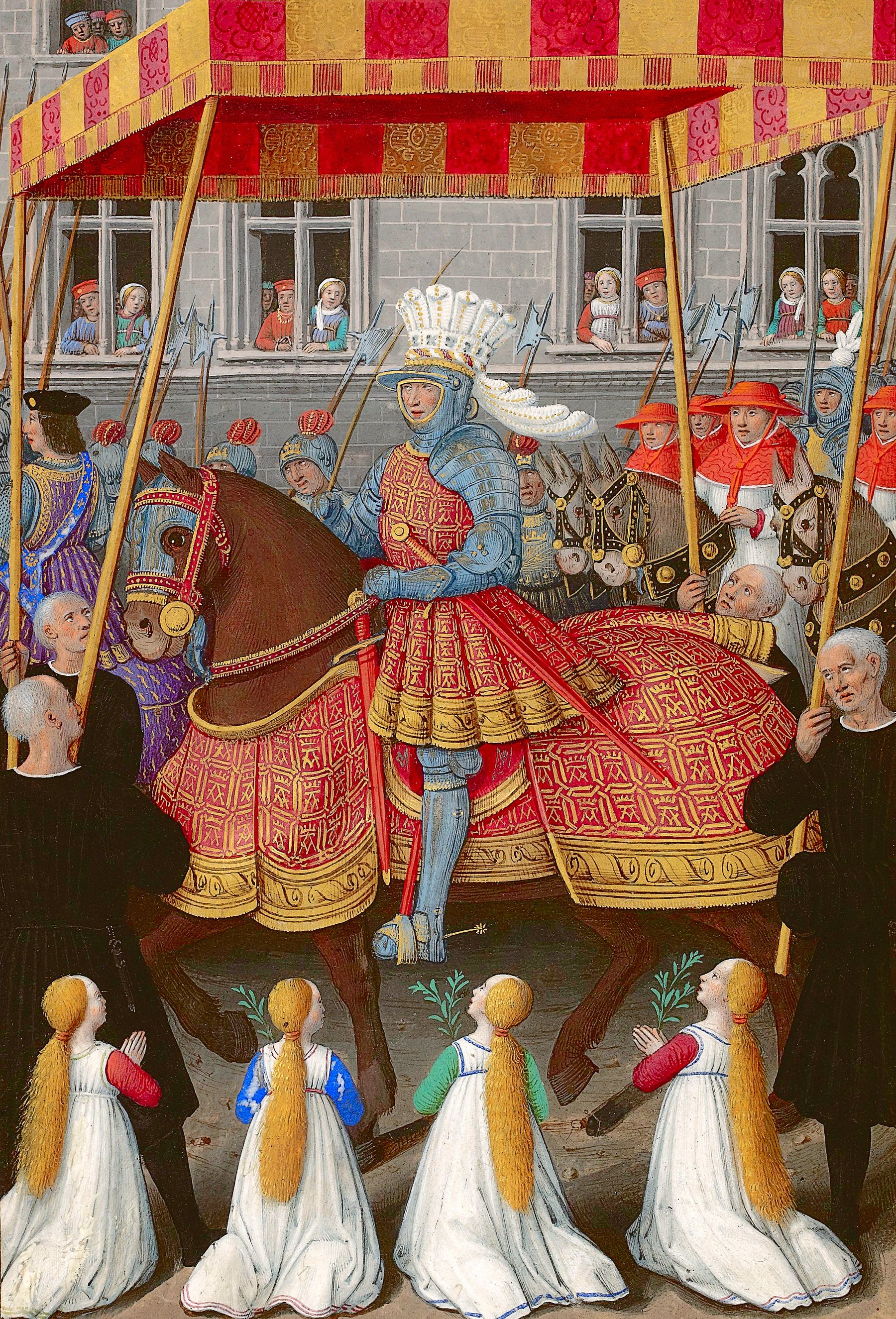 Миниатюра «Торжественный въезд Людовика XII в Геную» — одна из иллюминаций «Путешествия в Геную». Она изображает торжественный вход короля, рыцарей и свиты в город. Задача иллюстрации, подобно другим в манускрипте, — прославить короля как завоевателя и мудрого правителя. Людовик XII восседает на благородном коне в пышном убранстве с рыцарским шлемом с белыми перьями — замена короне. Правитель окружен рыцарями и приближенными: они едут на конях возле него: чинно в ряд за солдатами или же поддерживают навес с королевским орнаментом. Въезд правителя представлен как триумфальное шествие: линия вошедших в Геную зданий с выглядывающими из окон горожанами подчеркивает военный порядок. Встречающие девы в белых платьях со сложенными в молитвенный жест руками и зелеными ветвями с листьями — олицетворение подчинения и приветствия, а также тонкая библейская отсылка ко входу Иисуса Христа в Иерусалим. Девы расположены на переднем плане, тогда как фоном служат стены жилых генуэзских зданий и жители за оконными рамами, отделяющими их от нового политического уклада