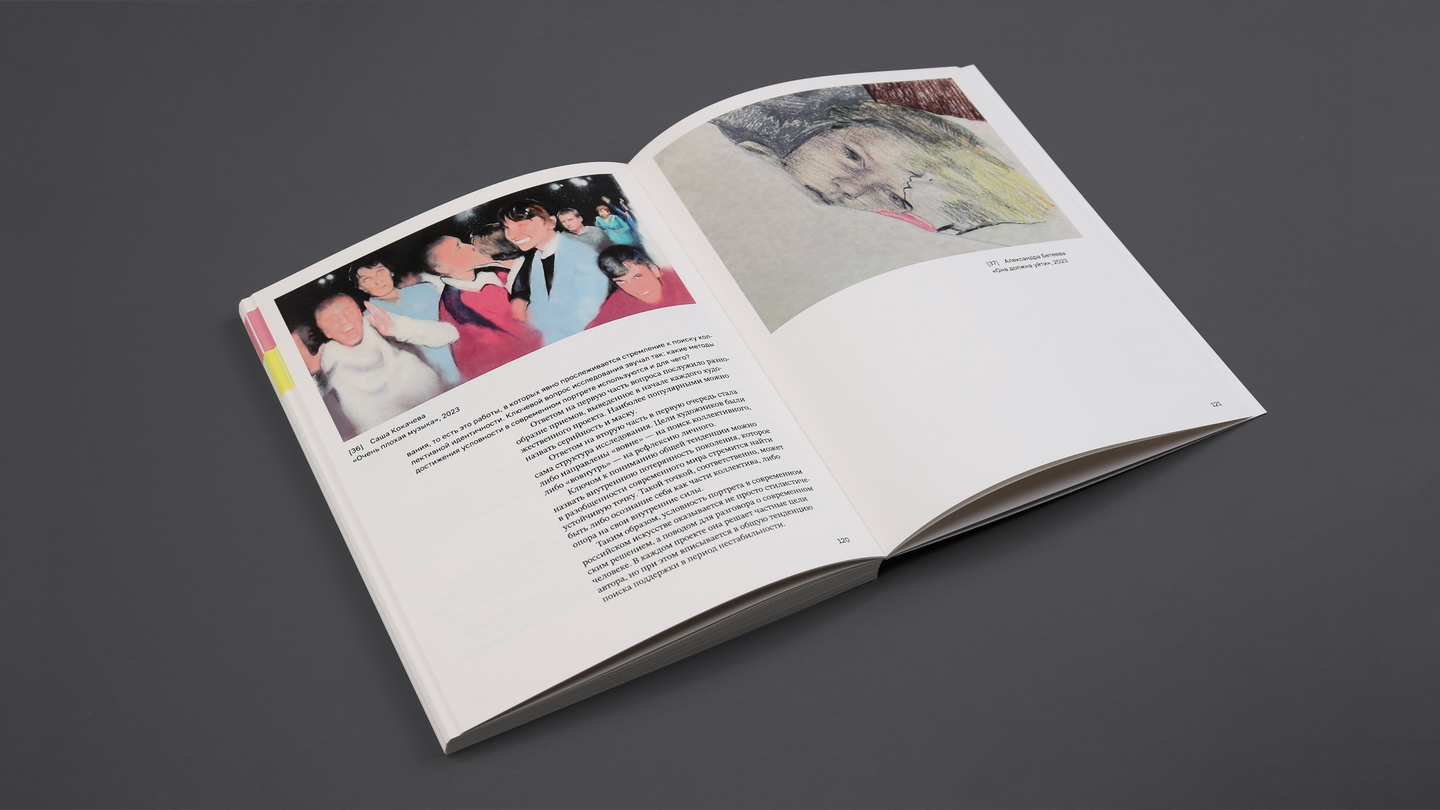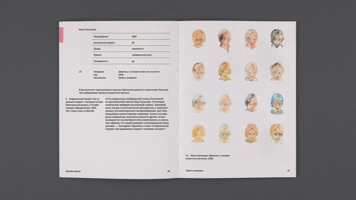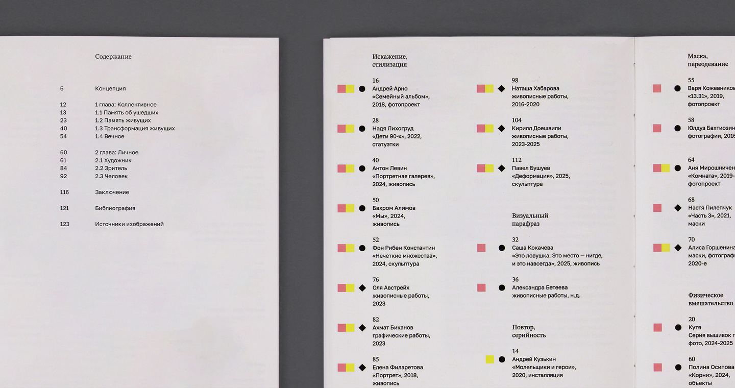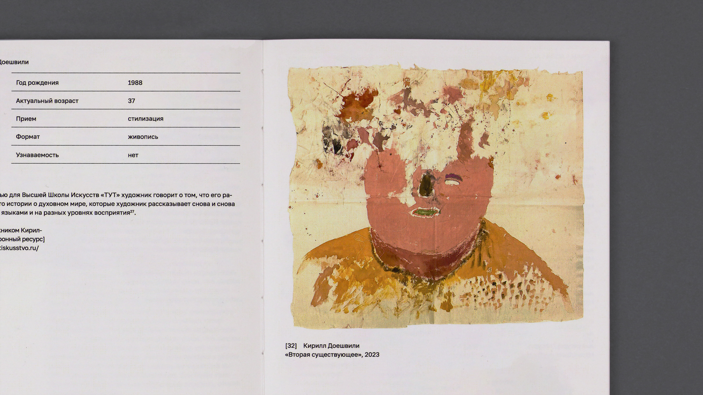 Разворот с информацией о проекте и художнике; разворот с продолжением работ и вводным текстом следующей подглавы