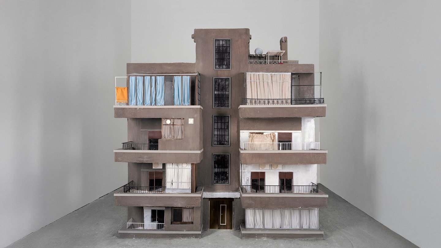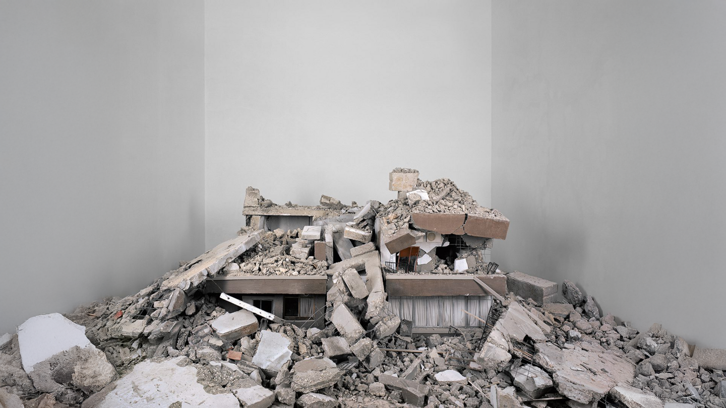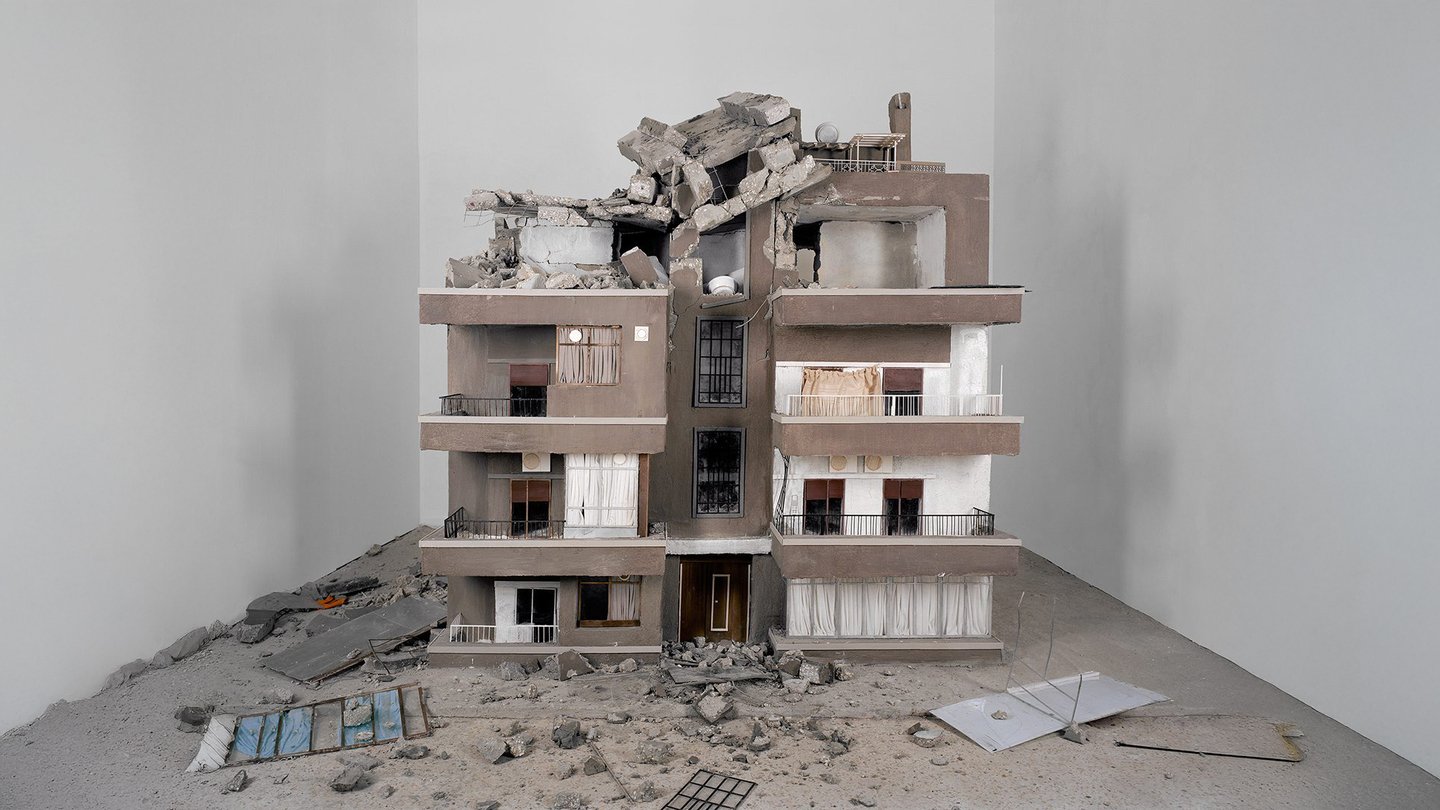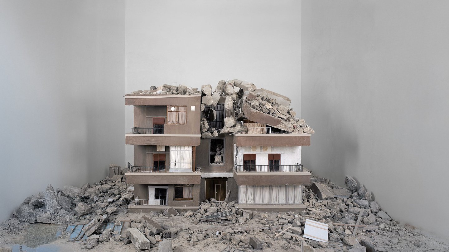 В двухканальном видео Храир Саркиссьян показывает на одном экране модель типичного сирийского многоквартирного дома, которая постепенно разрушается невидимой силой, а на другом — себя, разбивающего идентичную модель кувалдой. Само здание — дом в Дамаске, где художник вырос и где продолжают жить его родители, в то время как он сам находится в изгнании. С одной стороны, это попытка изобразить самое страшное — уничтожение родного дома войной, а с другой — взять контроль над этим домом, разрушая его своими руками. Тоска по дому здесь ощущается как невозможность защитить место и людей на расстоянии и как болезненный разрыв между местом рождения и собственным местонахождением.