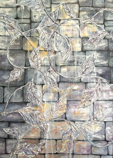Время неумолимо разрушает созданное человеком, напоминая о изменчивой природе. О цикличности изменений говорят прорастающие растения на стене, что подчеркивает зарождение одного предмета и распада другого. Это создает ощущение непрерывного потока, где каждое завершение ведет к новому началу. Картина вызывает размышления о том, что материальные системы преходящи и подвержены метаморфозам. Стена со временем разрушается, в ней появляется все больше трещин, при этом растения здесь выходят на первый план, показывая доминирующую роль. Изображение растений осязаемо и раскрывается в металлическом алюминиевом цвете, что подчеркивает силу природных ресурсов. В этом контексте полупрозрачная фигура становится символом души, которая переживает физическую трансформацию вместе с окружением. Важной идеей в картине выступает пластичность человека в течение изменчивого времени. Таким образом, картина служит визуальным воплощением хрупкости мира, его бесконечной смене форм. Сюжет помогает зрителю осознать неустойчивость материальных ценностей и принять постоянство перемен как естественную часть существования для нахождения своего места в этом мире.