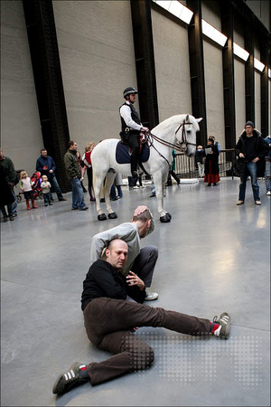 Иллюстрацией «хорошего» искусства можно назвать перфоманс Тааны Бругеры под названием Tatlin’s Whisper #5, проводимого в зале музея Tate Modern. Он заключался в том, что двое сотрудников конной полиции ворвались в зал музея и начали «управлять» зрителями, применяя стандартные техники для контроля толпы: приказы, разгон, регулировка движения. Зрители, пришедшие в культурное место внезапно стали частью опыта принуждения и подчинения — без эстетической дистанции.
