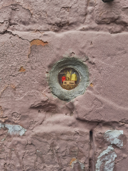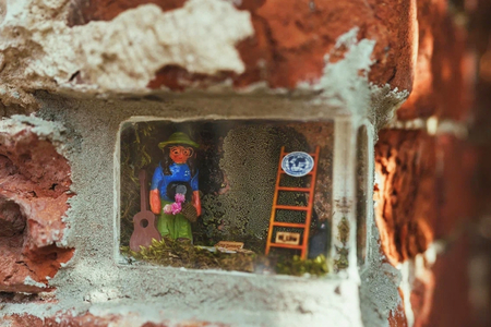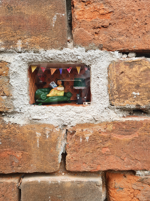 Можно сказать, что её работы про детское освоение масштаба во взрослом, необьятном мире. Поэтому, исходным мотивом для сравнения в исследовании — выступает кукольный дом. Тщательно собранные миниатюры с уютным интерьером, сцены взаимодействия персонажей друг с другом и окна микро-витрин — монтируются в реальные ниши городских стен и отсылают нас к собственным кукольным комнатам и городкам в детстве.
