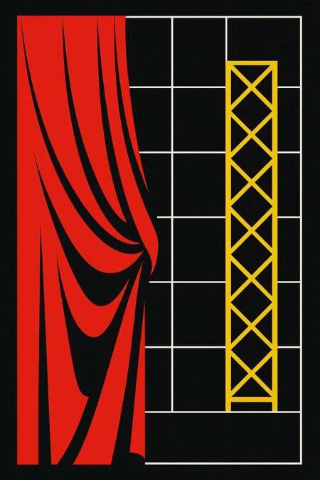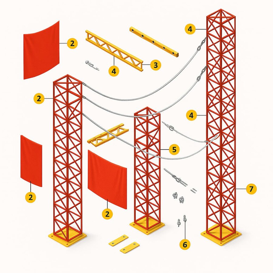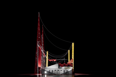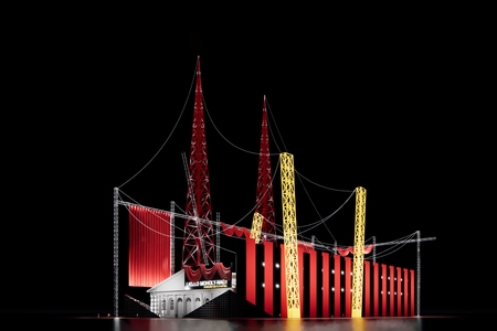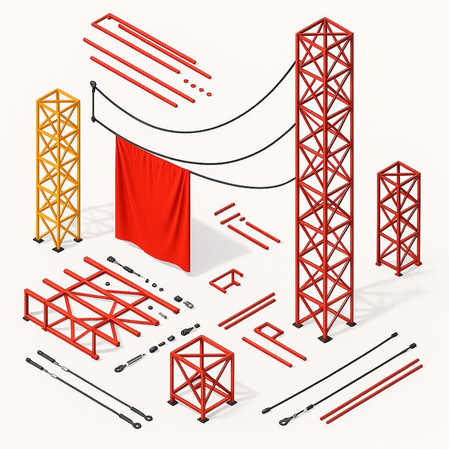 Modular constructivist truss installation at night: tall red steel lattice towers, auxiliary yellow towers, catenary cables glowing like long-exposure light, deep black background, red draped fabric panels, high contrast, crisp architectural photography, volumetric light haze, perfectly straight horizons, no people, productized startup look, brand colors (red