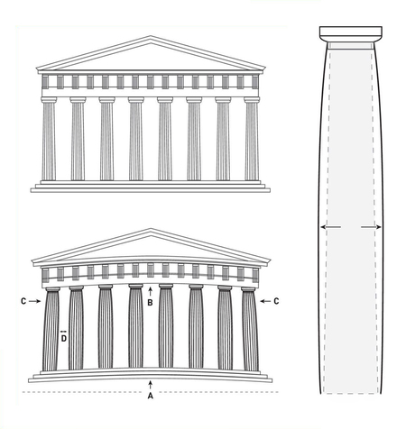 Слева: схема курватуры и энтазиса в архитектуре [6]; справа: Парфенон, Афинский акрополь (447–438 года до н. э.) [7]