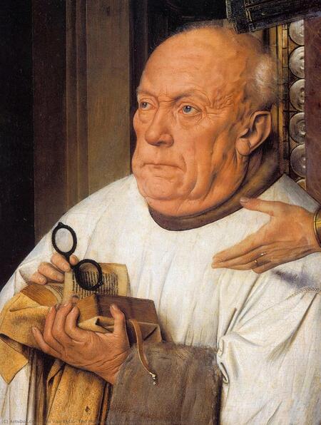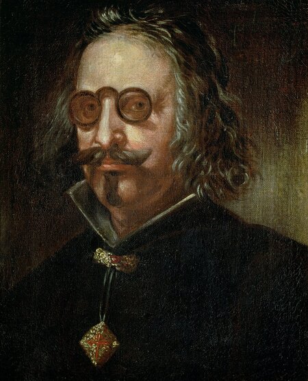 Слева: поэт и прозаик Франсиско де Кеведо (1584 — 1645) [18]; справа: Ян Ван Ейк «Мадонна каноника Ван дер Пале», 1436 год [19]