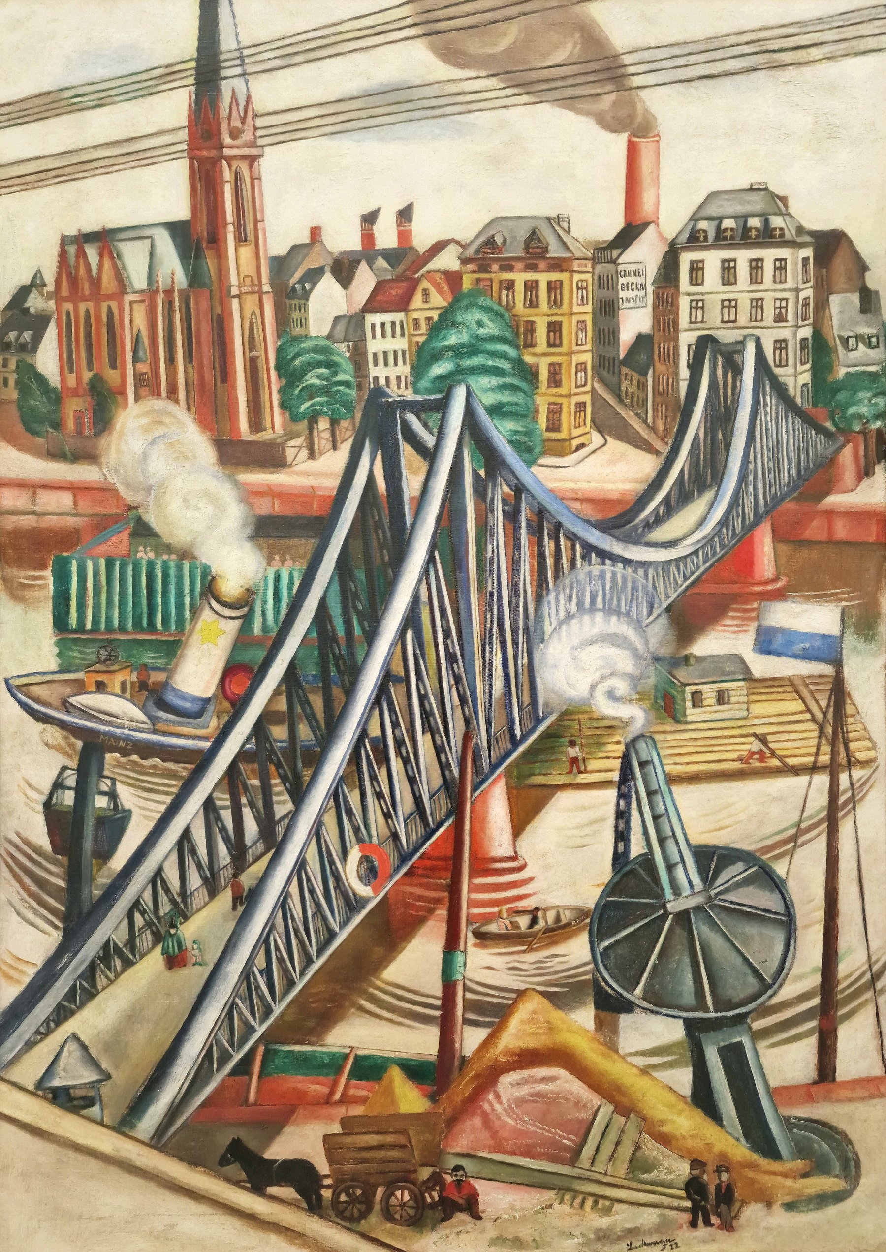 Городской пейзаж немецкого художника Макса Бекмана «Железный мост (Вид Франкфурта)» (1922) — наглядный пример экспрессионистского взгляда на шумный индустриальный пейзаж. Изображая знаменитый железный мост через Майн во Франкфурте, Бекман превращает городское пространство в кипучий ритм линий, конструкций, дыма, транспорта, промышленных механизмов. Картина передает импульс послевоенной современной жизни, контраст между динамизмом прогресса и одновременно скрытой тревогой неизвестного будущего. Смешанные чувства автора работы по поводу всеобщей модернизации, саднящий контекст первых лет после Первой мировой — все это растворено в строгости и стремительности индустриальной эпохи.