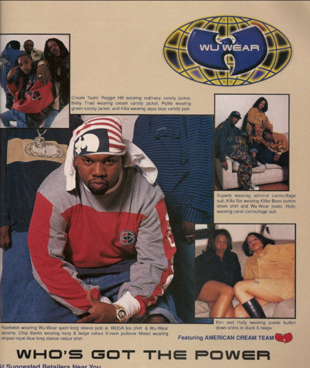 Большое влияние на моду оказала хип-хоп группа Wu-Tang Clan. Тексты их песен мрачные и непринужденные, которые отражают трудности жизни, как и их стиль. В 1995 году группа выпустила свою первую линию одежды — Wu-Wear. Это было заявлением о своей идентичности и хорошей маркетинговой стратегией, так как они позволили поклонникам подражать своим любимым исполнителям. Именно так Wu-Wear установил связь между хип-хоп культурой и уличной модой. Рекламная компания Wu-Wear была сфокусирована на комфорте и аутентичности. На снимках были участники группы в уютной локации и оверсайз вещах бренда.