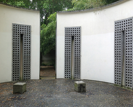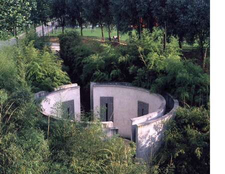 Это пространство с двойными стенами, скрытое в бамбуковой роще парка. Восемь «звуковых колонн» в пятиметровых стенах образуют резонирующее тело, которое концентрирует звук благодаря весу и напряжению изогнутых поверхностей. Звук, исходящий из динамиков внутри колонн, гармонично сочетается с цилиндрической формой, журчанием воды, стекающей с колонн в бассейн под полом, и круглым небом над ними, создавая медитативное пространство, отгороженное от городской среды.