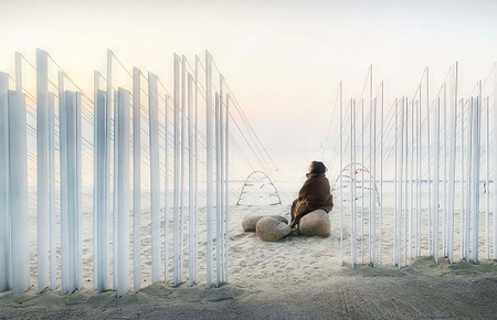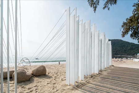 Перед входом в павильон посетители проходят через ограждения разной высоты и с разным шагом, создавая ощущение расстояния до морского пейзажа. При входе в павильон лески образуют художественную, криволинейную среду. Естественный свет и тени, переплетаясь со звуком ветра, создают ритмичный эффект, демонстрируя разнообразие и богатство прибрежной среды.