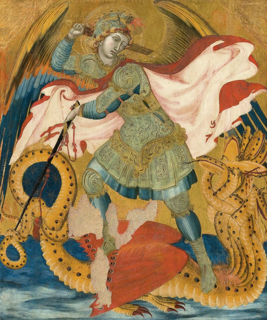 Saint Michael The Archangel Slaying The Dragon Between Saints Bartholomew And Benedict